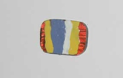 We are not a production house. We try and make every piece as clean and exciting as possible. As such we do not worry about doing one or two extra fusings on a piece. When we combine a painted piece with a base (or cap), we try and determine visually if there is any texture caused by the paint. If so, we fuse our next piece using chads in each corner. I always use chads when there is mica involved. A chad is a cube of glass cut to approximately 1/8 inch per side. The exact size of the chad is not important as it will be cold worked (cut or ground) out after firing. The chad causes the top glass to sag in the center causing the air to be pushed from the inside out.