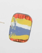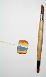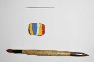 Painted with yellow blue and white, Scratched with toothpick, Scratched with rubber clay shaper.